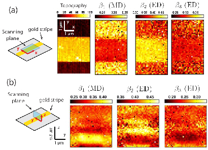We performed scans on a reflective gold stripe in 3 dimensions and recorded the intensity of each fluorescence line. In collaboration with A. Cazé and R. Carminati, we calculated the relative importance of the MD and ED lines and showed that the technique permits to map the electric and magnetic radiative parts of the local optical density of states (see Fig. 2).