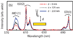 To observe this effect, we glued a 200nm-sized europium doped fluoride nanocrystal at the end of a sharp tip and recorded fluorescence spectra as a function of the distance between the tip and the surface. As seen in Fig. 1, when the fluorescence of the MD transition increases, the intensity of the ED one decreases. The color of the nanocrystal slightly changes as a function of its distance to the surface.