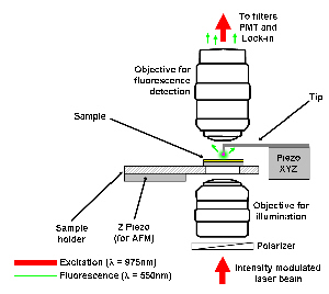 Plasmon polaritons (SPP) are surface waves that propagate on thin metallic films, at the interface between a metal and a dielectric (the air for instance). These waves can transport light on distances much larger than the wavelength, while remaining confined in the surface region. A way to create these waves is to nanostructure the sample, for instance by creating nano-apertures. With the fluorescent particle glued at the end of the tip (see the experimental set-up in Fig. 1), we have been able to vizualize the surface waves created by nanoslit apertures made in a thin gold film.