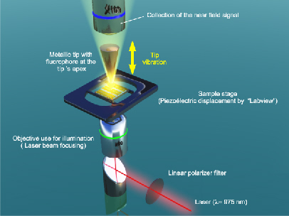 We are studying the local optical properties of dielectric and metallic nanoparticles by near-field optics. The field distribution is measured with our home-built SNOM which uses a small fluorescent nanocrystal as a sensor. The experimental setup is described in Fig. 1. Illumination can be performed in a transmission or a reflection mode at normal or oblique incidence.