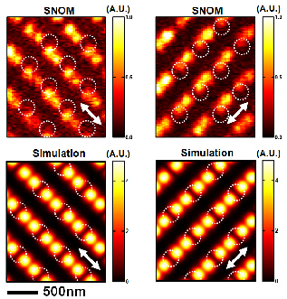 Fig. 2 : Near-field above an array of gold nanodisks : experiment (top) and simulation (bottom). The arrows indicate the incident polarization direction.