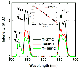 The materials we use (Er/Yb codoped particules) have a very interesting property. Two of their emission lines (at 520 and 550nm) come from levels that are in thermal equilibrium. The fluorescence intensity ratio is directly linked to the temperature of the particle by a low of the form :