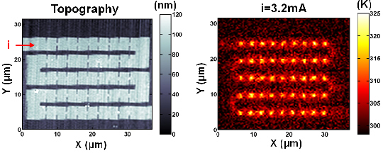 Fig. 2 : Topography and temperature map of an electrically excited 100nm-wide Ti nanowire.