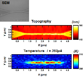 We are currently using the technique to observe the heating of electronic devices and nanoheaters, and to study the heat transfer mechanisms at the sub-micron scale. As examples, the images of Fig. 2 show the topography and the temperature of a 100nm wide Ti nanowire run by an electrical current. Similarly, images of Fig.3 show the topography and the temperature map of a titanium microstripe in which small constriction have been made. Hot spots are visible at every constriction where the current density is high.