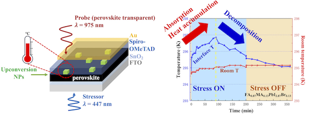 Figure caption : (À gauche) : schéma de l’architecture du dispositif et de la stratégie d’intégration de nanoparticules de conversion ascendante (UCNPs) comme nanothermomètres à l’interface enfouie pérovskite/HTL ; (À droite) : évolution de la température interfaciale au cours de la dégradation accélérée sous illumination. Les mesures révèlent des mécanismes concurrents, incluant l’accumulation thermique et la décomposition du matériau, dont la dominance relative dépend à la fois de l’intensité du « stressor » appliqué et de la composition de la pérovskite