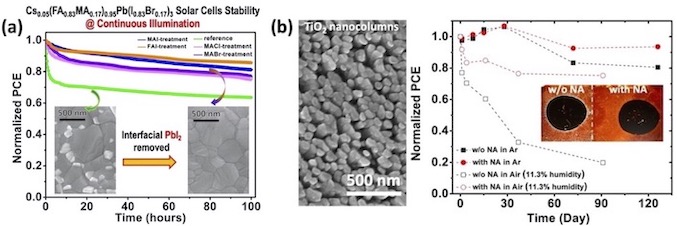 Figure caption : (a) Évolution du rendement sur 100 h de cellules solaires à pérovskite triple cation CsMAFAPb(I1-xBrx)3 non encapsulées, dont la couche active a été traitée par MAI (bleu), FAI (orange), MABr (violet) ou MACl (rose), en comparaison avec une cellule de référence sans traitement (vert). Les mesures sont réalisées sous illumination continue AM 1.5G (100 mW cm-2) en atmosphère inerte (boîte à gants Ar). L’encart montre des images SEM de la couche active avant et après traitement MAI, illustrant l’élimination du PbI2 interfacial en excès. (b) À gauche : image SEM de nanocolonnes de TiO2 alignées verticalement. À droite : comportement en dégradation de cellules solaires à pérovskite triple cation utilisant une couche de transport d’électrons plane ou nanostructurée (nanocolonnes de TiO2). L’encart présente une image optique de deux dispositifs fabriqués sur le même substrat après vieillissement à l’air, sans (gauche) et avec (droite) nanocolonnes de TiO2.